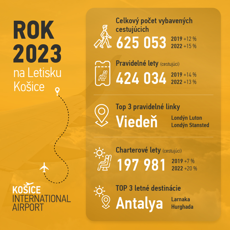 Je to oficiálne: v roku 2023 letisko Košice zaznamenalo historický rekord v počte vybavených pasažierov. Jeho bránami prešlo spolu 625 053 cestujúcich. To je o 15 % viac ako v roku 2022 a o 12 % viac ako v predpandemickom roku 2019. Pokiaľ ide o tempo zotavenia sa po pandémii COVID-19, patrí košické letisko medzi európskych premiantov. V priemere totiž európske letiská stále nedosiahli výkonnostnú úroveň spred pandémie.